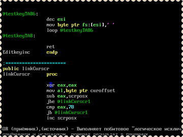 A small editor with syntax highlighting for Assembly language additionally displays in the bottom line the description of the command or its operand pointed to by the cursor.