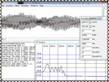 Graphical interface for the software module for generating sound vibrations. One of the multimedia data modeling tools. Designed for modeling instruments and sound effects.